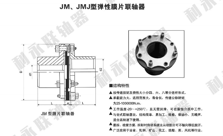 JM型膜片聯(lián)軸器是 具代表性的金屬擾性聯(lián)軸器,它在各種機械設(shè)備上都可以采用。其膜片采用0.3~2mm厚的 高強度不透鋼薄板鉚制成組件,上面有4~16個鉸制孔,用螺拴分別與主、從動法蘭聯(lián)結(jié)。運行中膜片受拉、壓、扭應(yīng)力。這種聯(lián)軸器制造成本低,傳遞扭矩范圍大,力學性能好,裝拆方便,對安裝精度要求不高,它集中體現(xiàn)了擾性聯(lián)軸器的優(yōu)點,可廣泛應(yīng)用于各種領(lǐng)域,適應(yīng)多種工況條件,例如泵、風機、軋機、造紙機械、電力機械、水泥機械、船舶工業(yè)、航空航天等。由于其減振性能好、傳動平穩(wěn),在各種行業(yè)的應(yīng)用中, 普通的贊同和采用,尤其是在造紙行業(yè)中,它能使您生產(chǎn)出的紙張 加平整、光滑、質(zhì)量大幅度提高,使您能夠始終 一步,同時也是發(fā)電廠、石化廠、水泥廠、軋鋼廠、礦山等進行技術(shù)改造、替代進口、節(jié)能降耗的 佳選擇。